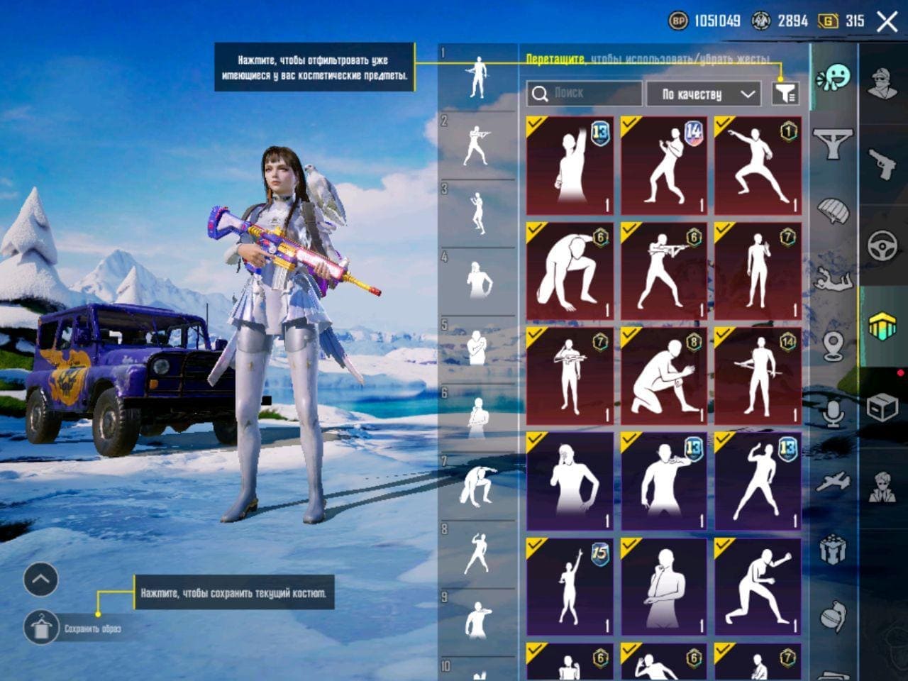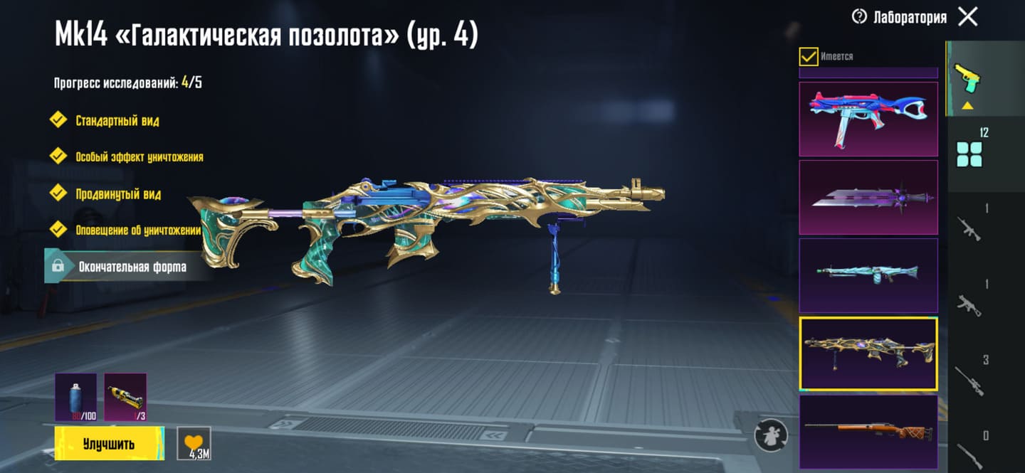 👚 Костюмы: 38 🔫 Скины оружия: 36 ✨ Улучшенные: UMP45 "Эми" (Lv.4), Mk14 "Галактическая позолота" (Lv.3) 🚗 Транспорт: 1 ⭐ Royale Pass: с 7 сезона 👤 Уровень: 56 🏆 Ранг: Мастер